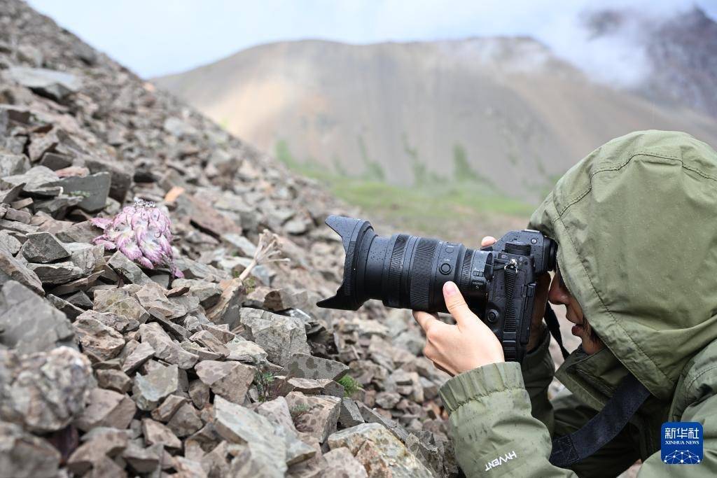 7月25日,一位摄影师在云南省迪庆藏族自治州德钦县一处流石滩拍摄水母雪兔子。
