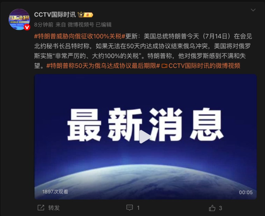 当地时间7月14日,美国总统特朗普称对俄罗斯感到非常不满,威胁将对俄罗斯征收100%的关税。他在会见北约秘书长吕特时称,如果无法在50天内达成协议结束俄乌冲突,美国将对俄罗斯实施“非常严厉的、大约100%的关税”。